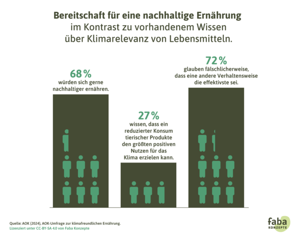 Eine repräsentative forsa-Umfrage Anfang 2024 hat gezeigt, dass sich zwar über zwei Drittel der Befragten gerne nachhaltiger ernähren würden, aber lediglich ein gutes Viertel (27 %) weiß, dass der reduzierte Konsum von Tierprodukten den stärksten Effekt auf das Klima hat. 2